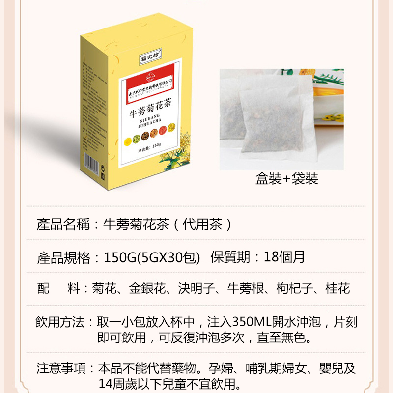 南京同仁堂牛蒡菊花茶含有牛蒡苷、菊糖等成分,能夠降低血壓、血糖,適合高血壓、糖尿病患者飲用的降血壓茶、降血糖茶、決明子茶、牛蒡茶、三高茶有助排毒利水,改善血壓、血糖、血脂問題。
